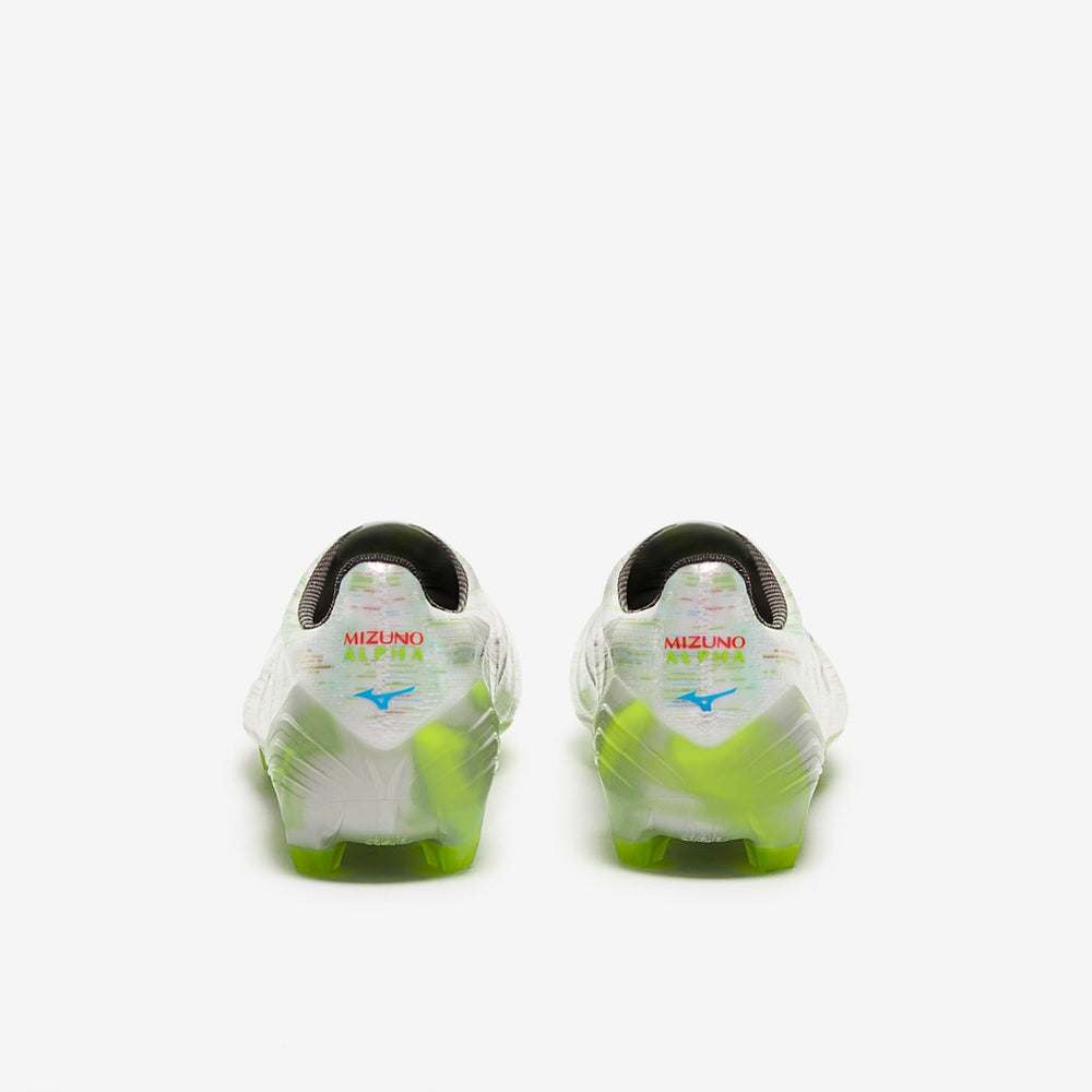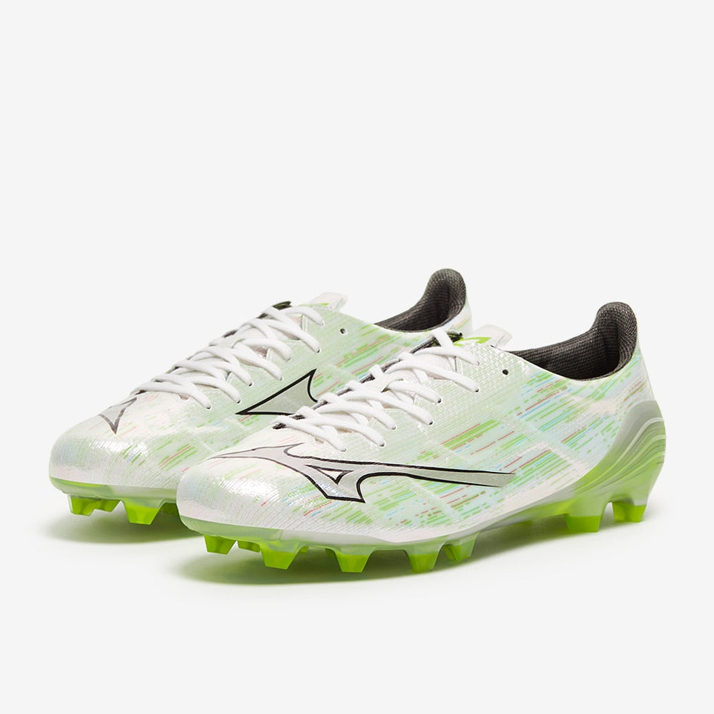 Experience the pinnacle of speed with Mizuno Alpha II Elite Made in Japan FG football boots in White/Silver Iridiscent/Black.