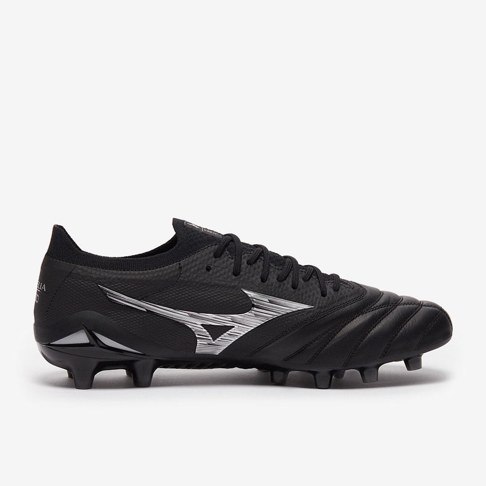 Play beyond fast wearing Mizuno Morelia Neo IV Beta Made In Japan FG football boots in Black/Galaxy Silver/Black.
